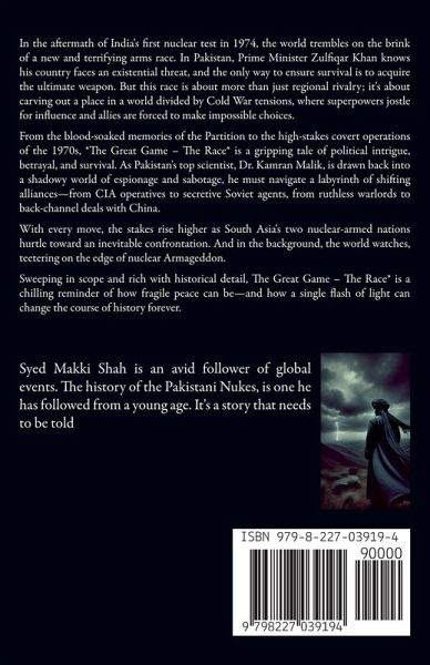 In the aftermath of India's first nuclear test in 1974, the world trembles on the brink of a new and terrifying arms race. In Pakistan, Prime Minister Zulfiqar Khan knows his country faces an existential threat, and the only way to ensure survival is to acquire the ultimate weapon. But this race is about more than just regional rivalry; it's about carving out a place in a world divided by Cold War tensions, where superpowers jostle for influence and allies are forced to make impossible choices. From the blood-soaked memories of the Partition to the high-stakes covert operations of the 1970s, *The Great Game - The Race* is a gripping tale of political intrigue, betrayal, and survival. As Pakistan's top scientist, Dr. Kamran Malik, is drawn back into a shadowy world of espionage and sabotage, he must navigate a labyrinth of shifting alliances-from CIA operatives to secretive Soviet agents, from ruthless warlords to back-channel deals with China. With every move, the stakes rise higher as South Asia's two nuclear-armed nations hurtle toward an inevitable confrontation. And in the background, the world watches, teetering on the edge of nuclear Armageddon. Sweeping in scope and rich with historical detail, The Great Game - The Race* is a chilling reminder of how fragile peace can be-and how a single flash of light can change the course of history forever.