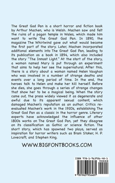 The Great God Pan is a short horror and fiction book by Arthur Machen, who is Welsh. Machen saw and felt the ruins of a pagan temple in Wales, which made him want to write The Great God Pan. In 1890, the magazine The Whirlwind gave out what would become the first part of the story. Later, Machen incorporated additional elements into The Great God Pan, leading to its publication as a book in 1894, which also included the story "The Inmost Light." At the start of the story, a woman named Mary is put through an experiment that aims to help her see the supernatural. After this, there is a story about a woman named Helen Vaughan who was involved in several strange deaths and events over a long period. In the end, the heroes talk to Helen and make her kill herself. Before she dies, she goes through a series of strange changes that show her to be a magical being. When the story came out, the press widely viewed it as degenerate and awful due to its apparent sexual content, which damaged Machen's reputation as an author. Critics re-evaluated Machen's work in the 1920s, establishing The Great God Pan as a classic in the horror genre. Literary experts have acknowledged the influence of other 1800s works on The Great God Pan, yet they disagree on its classification as Gothic or science fiction. The short story, which has spawned two plays, served as inspiration for horror writers such as Bram Stoker, H. P. Lovecraft, and Stephen King.