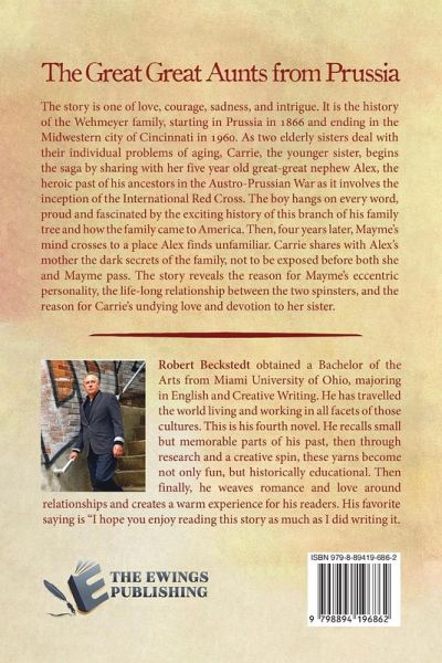 The story is one of love, courage, sadness, and intrigue. It is the history of the Wehmeyer family, starting in Prussia in 1866 and ending in the Midwestern city of Cincinnati in 1960. As two elderly sisters deal with their individual problems of aging, Carrie, the younger sister, begins the saga by sharing with her five year old great-great nephew Alex, the heroic past of his ancestors in the Austro-Prussian War as it involves the inception of the International Red Cross. The boy hangs on every word, proud and fascinated by the exciting history of this branch of his family tree and how the family came to America. Then, four years later, Mayme's mind crosses to a place Alex finds unfamiliar. Carrie shares with Alex's mother the dark secrets of the family, not to be exposed before both she and Mayme pass. The story reveals the reason for Mayme's eccentric personality, the life-long relationship between the two spinsters, and the reason for Carrie's undying love and devotion to her sister.