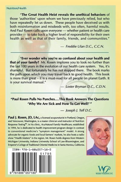 This book reveals how your health and that of your family has been systematically usurped since the early 1900's. Through misdirection, misrepresentation and misdeeds, leaders in science, medicine and business have failed you. AND it appears we simply can't rely on the those charged with the duty to safeguard our air, food, water and drug supply. In the meantime, your health slowly slips away. What to do? As an expert in acupuncture and herbal medicine as well as a master of a breakthrough method of nutritional evaluation called Nutrition Response Testing, Paul J. Rosen reveals how to take back control of your health safely, naturally and effectively. Patient testimonials recount how their evaluation cleared up their confusion as well as provided the answer to getting well. What are you waiting for?