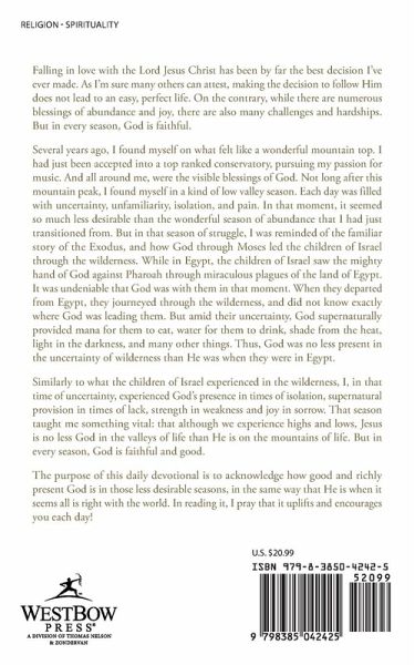 Falling in love with the Lord Jesus Christ has been by far the best decision I've ever made. As I'm sure many others can attest, making the decision to follow Him does not lead to an easy, perfect life. On the contrary, while there are numerous blessings of abundance and joy, there are also many challenges and hardships. But in every season, God is faithful. Several years ago, I found myself on what felt like a wonderful mountain top. I had just been accepted into a top ranked conservatory, pursuing my passion for music. And all around me, were the visible blessings of God. Not long after this mountain peak, I found myself in a kind of low valley season. Each day was filled with uncertainty, unfamiliarity, isolation, and pain. In that moment, it seemed so much less desirable than the wonderful season of abundance that I had just transitioned from. But in that season of struggle, I was reminded of the familiar story of the Exodus, and how God through Moses led the children of Israel through the wilderness. While in Egypt, the children of Israel saw the mighty hand of God against Pharoah through miraculous plagues of the land of Egypt. It was undeniable that God was with them in that moment. When they departed from Egypt, they journeyed through the wilderness, and did not know exactly where God was leading them. But amid their uncertainty, God supernaturally provided mana for them to eat, water for them to drink, shade from the heat, light in the darkness, and many other things. Thus, God was no less present in the uncertainty of wilderness than He was when they were in Egypt. Similarly to what the children of Israel experienced in the wilderness, I, in that time of uncertainty, experienced God's presence in times of isolation, supernatural provision in times of lack, strength in weakness and joy in sorrow. That season taught me something vital: that although we experience highs and lows, Jesus is no less God in the valleys of life than He is on the mountains of life. But in every season, God is faithful and good. The purpose of this daily devotional is to acknowledge how good and richly present God is in those less desirable seasons, in the same way that He is when it seems all is right with the world. In reading it, I pray that it uplifts and encourages you each day!