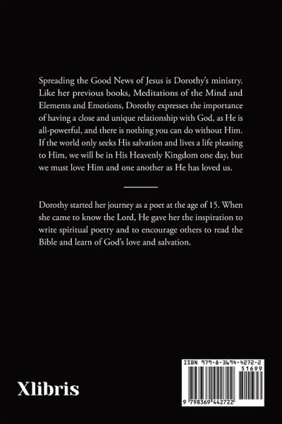 Spreading the Good News of Jesus is Dorothy's ministry. Like her previous books, Meditations of the Mind and Elements and Emotions, Dorothy expresses the importance of having a close and unique relationship with God, as He is all-powerful, and there is nothing you can do without Him. If the world only seeks His salvation and lives a life pleasing to Him, we will be in His Heavenly Kingdom one day, but we must love Him and one another as He has loved us.