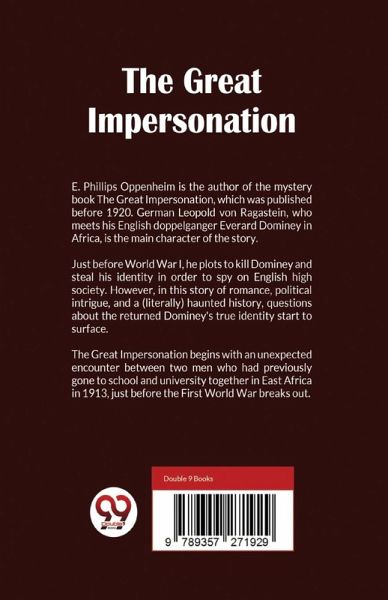 E. Phillips Oppenheim is the author of the mystery book The Great Impersonation, which was published before 1920. German Leopold von Ragastein, who meets his English doppelganger Everard Dominey in Africa, is the main character of the story. Just before World War I, he plots to kill Dominey and steal his identity in order to spy on English high society. However, in this story of romance, political intrigue, and a (literally) haunted history, questions about the returned Dominey's true identity start to surface. The Great Impersonation begins with an unexpected encounter between two men who had previously gone to school and university together in East Africa in 1913, just before the First World War breaks out.
