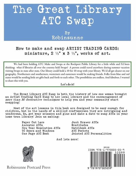 The Great Library ATC Swap is both the history of how one woman brought an Artist Trading Card Swap to her local library and the encouragement of more than 30 decorative techniques to help you and your community start swapping! Most of the art lessons in this book are designed to be easy enough for children, but in the hands of a skilled craftsperson they are intriguing and wonderous. So, get your scissors and glue and make a date to swap ATCs in your home town library! Join us making: Paper Cut Lace Junk Drawer ATCs Ancestor ATCs Gratitudes New Year Resolution ATCs Matchbook ATCs TC Doors and Windows ATC Pockets One Page ATC Book Jointed ATC Personalities And lots more!