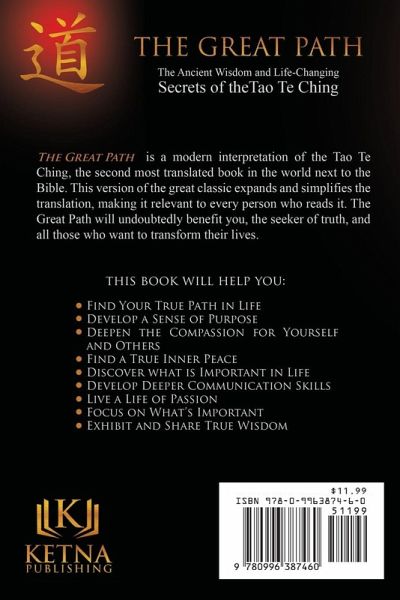 The Great Path is modern interpretation of the Tao Te Ching, the second most translated book in the world next to the Bible. This version of the great classic expands and simplifies the translation, making it relevant to every person who reads it. The Great Path will undoubtedly benefit you, the reader, the seeker of truth, and all those who want to transform their lives. This book will help you: Find your true path in life, develop a sense of purpose, deepen the compassion for yourself and others, find a true inner peace, discover what is important in life, develop better communication skills, live a life of passion, focus on what's important, and exhibit and share true wisdom.