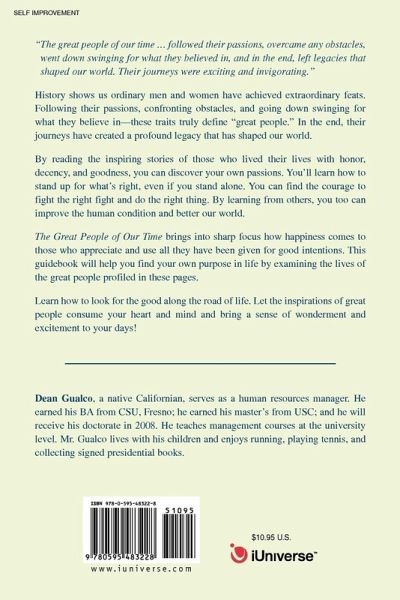 "The great people of our time . followed their passions, overcome any obstacles, went down swinging for what they believed in, and in the end, left legacies that shaped our world. Their journeys were exciting and invigorating." History shows us ordinary men and women have achieved extraordinary feats. Following their passions, confronting obstacles, and going down swinging for what they believe in-these traits truly define "great people." In the end, their journeys have created a profound legacy that has shaped our world. By reading the inspiring stories of those who lived their lives with honor, decency, and goodness, you can discover your own passions. You'll learn how to stand up for what's right, even if you stand alone. You can find the courage to fight the right fight and do the right thing. By learning from others, you too can improve the human condition and better our world. The Great People of Our Time brings into sharp focus how happiness comes to those who appreciate and use all they have been given for good intentions. This guide book will help you find your own purpose in life by examining the lives of the great people profiled in these pages. Learn how to look for the good along the road of life. Let the inspirations of great people consume your heart and mind and bring a sense of wonderment and excitement to your days!