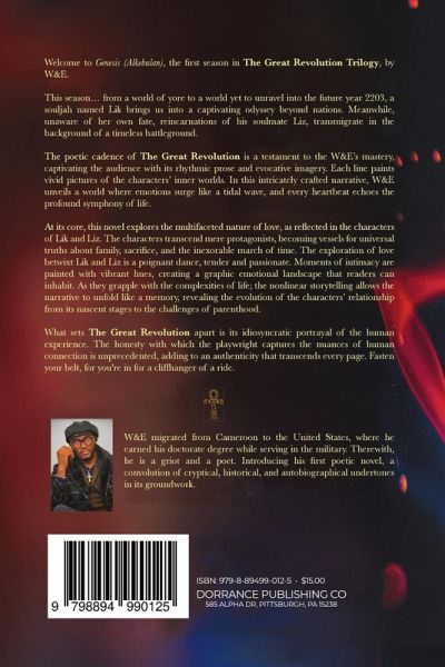 Welcome to Genesis (Alkebulan), the first season in The Great Revolution Trilogy, by W&E. This season... from a world of yore to a world yet to unravel into the future year 2203, a souljah named Lik brings us into a captivating odyssey beyond nations. Meanwhile, unaware of her own fate, reincarnations of his soulmate Liz, transmigrate in the background of a timeless battleground. The poetic cadence of The Great Revolution is a testament to the W&E's mastery, captivating the audience with its rhythmic prose and evocative imagery. Each line paints vivid pictures of the characters' inner worlds. In this intricately crafted narrative, W&E unveils a world where emotions surge like a tidal wave, and every heartbeat echoes the profound symphony of life. At its core, this novel explores the multifaceted nature of love, as reflected in the characters of Lik and Liz. The characters transcend mere protagonists, becoming vessels for universal truths about family, sacrifice, and the inexorable march of time. The exploration of love betwixt Lik and Liz is a poignant dance, tender and passionate. Moments of intimacy are painted with vibrant hues, creating a graphic emotional landscape that readers can inhabit. As they grapple with the complexities of life; the nonlinear storytelling allows the narrative to unfold like a memory, revealing the evolution of the characters' relationship from its nascent stages to the challenges of parenthood. What sets The Great Revolution apart is its idiosyncratic portrayal of the human experience. The honesty with which the playwright captures the nuances of human connection is unprecedented, adding to an authenticity that transcends every page. Fasten your belt, for you're in for a cliffhanger of a ride. About the Author W&E migrated from Cameroon to the United States, where he earned his doctorate degree while serving in the military. Therewith, he is a griot and a poet. Introducing his first poetic novel, a convolution of cryptical, historical, and autobiographical undertones in its groundwork.