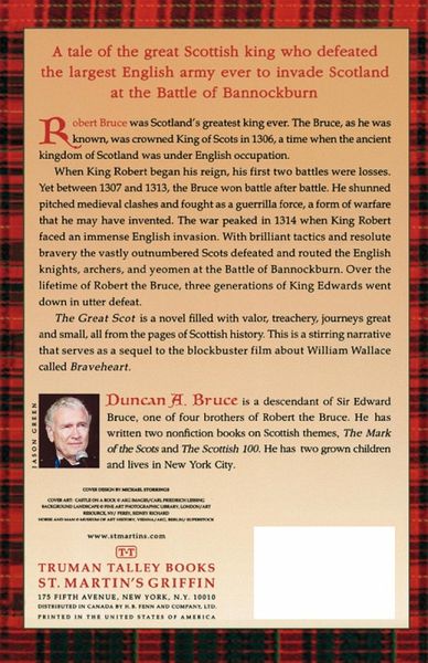 Robert the Bruce was Scotland's greatest King ever. The Bruce, as he was known, was crowned King of Scots in 1306, a time when the ancient kingdom of Scotland was under harsh and illegal English occupation. As soon as King Robert began his reign, his army was treacherously attack at Methven, resulting in a calamitous defeat for the Scots which forced the Bruce into hiding. Yet, steadily between 1307 and 1313 King Robert won battle after battle. shunning pitched medieval clashes, and fighting as a guerilla force, a form of warfare which he, perhaps, invented. The war peaked in 1314 when the Bruce faced a formidable English invasion. With brilliant tactics and resolute bravery the vastly outnumbered Scots defeated and routed the knights, archers, and foot soldiers of mighty England at the Battle of Bannockburn. And that's only the first part of this epic tale of the Bruce's long and event-filled life. The Great Scot is a novel filled with valor, treachery, passionate love, journeys great and small, and people of every rank and situation-all from the pages of Scottish history.