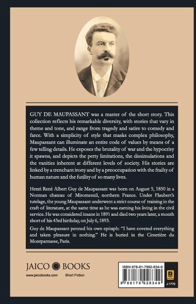 GUY DE MAUPASSANT was a master of the short story. This collection reflects his remarkable diversity, with stories that vary in theme and tone, and range from tragedy and satire to comedy and farce. With a simplicity of style that masks complex philosophy, Maupassant can illuminate an entire code of values by means of a few telling details. He exposes the brutality of war and the hypocrisy it spawns, and depicts the petty limitations, the dissimulations and the vanities inherent at different levels of society. His stories are linked by a trenchant irony and by a preoccupation with the frailty of human nature and the futility of so many lives.