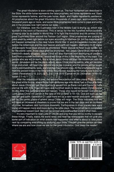 The great tribulation is soon coming upon us. The four horsemen are described in the Bible: the white horse represents the false prophets, red horse represents war, black horse represents famine, and the pale horse, death, and Hades represents pestilence. All prophecies about the great tribulation thousands of years ago, approximately two thousand years ago or more, and some Bible prophecies have come to pass and some are in the process now right before our eyes. For instance, now the Euphrates river in the Middle East is drying up, which was spoken in the book of Revelation. This is setup for the two hundred million soldiers crossing over to do battle in World War III to fight the Antichrist and his armies in the great Euphrates River around the Persian Gulf region. Bible prophecies are coming to pass week by week right before our eyes according to Matthew 24, but the major events will happen sometime in the near future World War III and Armageddon nuclear war, before the millennium and the new heaven and earth will happen. Matthews 24:22 states and excepts those days should be shortened. There should no flesh to be saved, but for the elects' sake, those days shall be shortened. Yes, Jesus Christ shall intervene in mankind's deadly situation. Jesus Christ will stop mankind from destroying all people's lives from a nuclear holocaust. I explained some of this in the beginning of my book. The people who are left on earth, this is when Jesus Christ will start the millennium with his saints. Jerusalem will be the place where Jesus Christ and his saints, who will become kings and priest, will teach the nations how to live in peace; and the people will be taught God's commandments, laws, and statutes they should obey. All the prophets and saints from the ancient times in the Bible will be resurrected, teaching the nations how to live for Christ (Revelation 5:10, 3:21, 22:5, 2:27, 1:6, 20:6; Ezekiel 44:23; Zechariah 14:16-19; Isaiah 2:1-4). After the millennium is over, the second resurrection will take place. This is called the great white throne, where those from centuries ago who never had a chance to hear about Jesus Christ will get their chance to accept him as there Lord and Savior to have eternal life with him. They will have one hundred years to serve Jesus Christ (Isaiah 65:20). After this, judgment seat will happen. Those who would not accept God and our Lord Jesus Christ will perish in the lake of fire (2 Peter 3:10-13). God will burn up the heaven and earth. Revelation 21 says there will be a new heaven and earth. Jerusalem will be the center place of where Jesus Christ will reign. The Bible indicates that we will have an increase of disasters to prove that we are in the last days and an increase of crime, tornadoes, and hurricane disasters. Earthquakes in diver places race wars (riots) will happen more and more during the latter days. The world will be in completely disobedience toward God. Men will be wicked and coldhearted toward other men. It's very important to read Luke 21:36-38 and pray that you will be worthy to escape these things. Finally, watch the world news and read the newspapers that will give you some sort of indication on what events has happened and what is about to take place next by comparing everything by studying your Bible. This will give the person an idea where we are and how close we are for the great tribulation. Get close to God by staying in prayer, and he will tell you what to do to prepare for the great tribulation. The Bible indicates in the latter days (end times), which we are in now. God bless the reader!