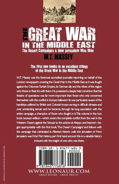 The first two books in an excellent trilogy of the Great War in the Middle East W. T Massey was the foremost accredited journalist reporting on behalf of the London newspapers covering the Great War in the Middle East as it was fought against the Ottoman Turkish Empire, its German ally and the tribes of the region who threw in their lot with them. He possessed a deeply held conviction that this theatre of operations was far more important than those who only concerned themselves with the conflict in Europe believed. He was particularly aware of the hardships suffered by British and Colonial troops serving in difficult climates and over unrelenting terrain and he became, through his long association with the entire campaign, a champion of those who fought in it. This volume in the two book Leonaur edition-which covers the complete conflict from the war in the Western Desert against the Senussi to the actions at Aleppo and beyond-begins appropriately with the first book, 'The Desert Campaigns' and follows with the campaign that culminated in Allenby's historic walk into Jerusalem in 'How Jerusalem was Won.' Part history, part first hand account this is a valuable history imbued with the insight of one who was there.