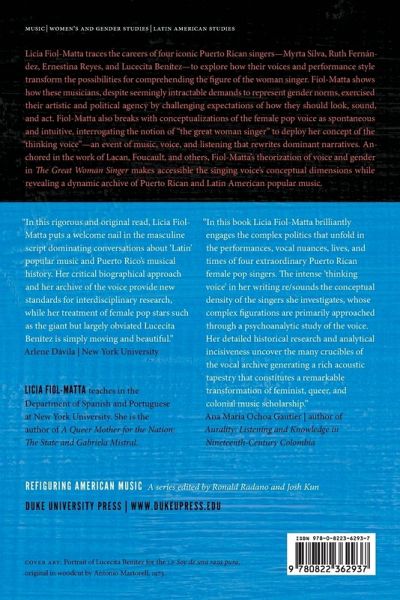 Licia Fiol-Matta traces the careers of four iconic Puerto Rican singers-Myrta Silva, Ruth Fernández, Ernestina Reyes, and Lucecita Benítez-to explore how their voices and performance style transform the possibilities for comprehending the figure of the woman singer. Fiol-Matta shows how these musicians, despite seemingly intractable demands to represent gender norms, exercised their artistic and political agency by challenging expectations of how they should look, sound, and act. Fiol-Matta also breaks with conceptualizations of the female pop voice as spontaneous and intuitive, interrogating the notion of "the great woman singer" to deploy her concept of the "thinking voice"-an event of music, voice, and listening that rewrites dominant narratives. Anchored in the work of Lacan, Foucault, and others, Fiol-Matta's theorization of voice and gender in The Great Woman Singer makes accessible the singing voice's conceptual dimensions while revealing a dynamic archive of Puerto Rican and Latin American popular music.