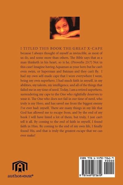 PSALMS 71:2 DELIVER ME IN THY RIGHTEOUSNESS, AND CAUSE ME TO ESCAPE INCLINE THINE EAR UNTO ME, AND SAVE ME I titled this book The Great X-Cape because I always thought of myself as invincible, as most of us do, and some more than others. The Bible says that as a man thinketh in his heart, so is he. (Proverbs 23:7) Not in this case! Imagine having Aquaman as your hero but he can't even swim, or Superman and Batman and they can't fly. I had my own self-made cape that I wore everywhere I went, being my own superhero. I had much faith in myself, in my abilities, my talents, my intelligence, and all of the things that failed me in my time of need. Today, I am a retired superhero, surrendering my cape to the One who rightfully deserves to wear it. The One who does not fail in our time of need, who truly is my Hero, and has saved me from the biggest enemy I've ever had: myself. There are many things in my life that God has allowed me to escape from, and by the end of my book I will have listed a lot of them, but truly, I just can't tell it all. By coming to the end of faith in myself, I found faith in Him. By coming to the end of my own life, I finally found His, and that is truly the greatest escape that we can ever make!
