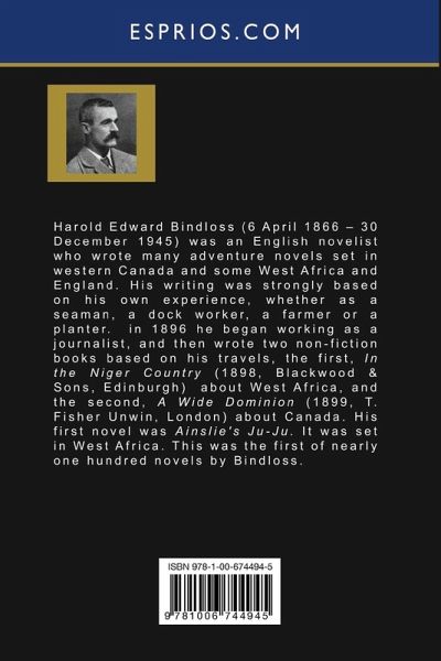 Harold Edward Bindloss (6 April 1866 - 30 December 1945) was an English novelist who wrote many adventure novels set in western Canada and some West Africa and England. His writing was strongly based on his own experience, whether as a seaman, a dock worker, a farmer or a planter. in 1896 he began working as a journalist, and then wrote two non-fiction books based on his travels, the first, In the Niger Country (1898, Blackwood and Sons, Edinburgh) about West Africa, and the second, A Wide Dominion (1899, T. Fisher Unwin, London) about Canada. His first novel was Ainslie's Ju-Ju. It was set in…mehr