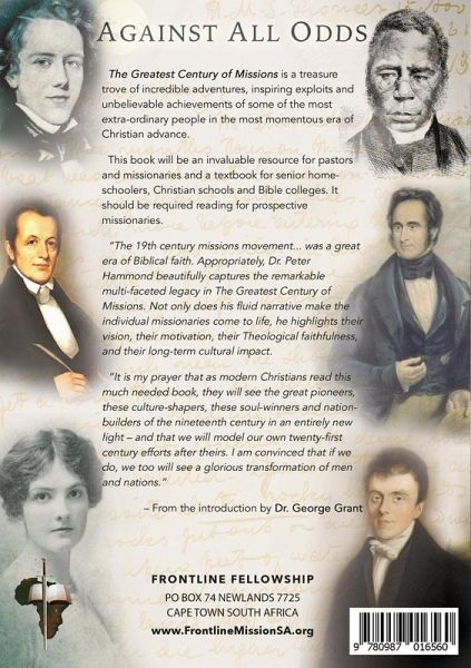 The Greatest Century of Missions book is a treasure trove of incredible adventures, inspiring exploits and unbelievable achievements of some of the most extra-ordinary people in the most momentous era of Christian advance. This book will be an invaluable resource for pastors and missionaries and a textbook for senior home-schoolers, Christian schools and Bible colleges. It should be required reading for prospective missionaries. Inspiring The Greatest Century of Missions is an inspiring series of stories of how God worked through the lives of faithful men and women willing to sacrifice all for Him. Christians serious about fulfilling the command to all of us to fulfil the Great Commission will be encouraged to become active in spreading the Gospel to those within their reach. This easy to read, well-illustrated summary of the lives and vision of exceptional missionaries is a must read for Christians of any age, including students in home schools, Christian schools, and colleges. Unprecedented As Church historian, Kenneth Scott Latourette, declared: "Never had any other set of ideas, religious or secular, being propagated over so wide an area by so many professional agents, maintained by the unconstrained donations of so many millions of individuals." Visionary In the words of Alexander Somerville, this was "a new enterprise on behalf of the noblest object that can engage the enthusiasm of man - the salvation of millions!" Overcoming Obstacles The obstacles, dangers and difficulties they had to face and overcome were staggering. Illegal By an act of British Parliament, missionaries were illegal in India. In China, not only was all missionary activity completely illegal, but so was attempting to learn the Chinese language! There was a ban on any Chinese teaching their language to foreigners. The Chinese tutors to Robert Morrison carried poison on their bodies so that if they were discovered, they could end their lives quickly and escape torture. Because the Chinese forbade foreign women, Robert Morrison had to live apart from his wife, Mary, for most of their lives, once for six years. Incarcerated America's first foreign missionary, Adoniram Judson, was captured on the high seas and incarcerated in a French prison - from which he escaped. Later he was imprisoned and tortured in 'Death Prison', in Burma, for eighteen months.