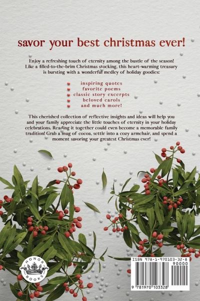 Enjoy a refreshing touch of eternity among the bustle of the season! Like a filled-to-the-brim Christmas stocking, this heart-warming treasury is bursting with a wonderful medley of holiday goodies including inspiring quotes, favorite poems, classic story excerpts, beloved carols, and much more!This cherished collection of reflective insights and ideas will help you and your family appreciate the little touches of eternity in your holiday celebrations. Reading it together coud even become a memorable family tradition! Grab a mug of cocoa, settle into a cozy armchair, and spend a moment savoring your greatest Christmas ever!