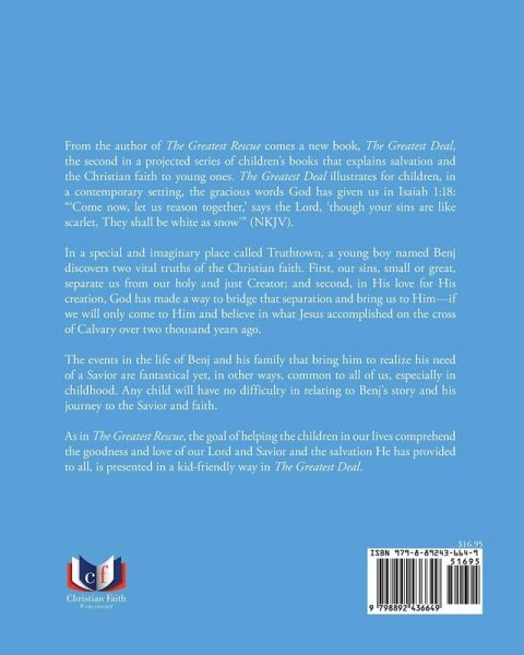 From the author of The Greatest Rescue comes a new book, The Greatest Deal, the second in a projected series of children's books that explains salvation and the Christian faith to young ones. The Greatest Deal illustrates for children, in a contemporary setting, the gracious words God has given us in Isaiah 1:18: "'Come now, let us reason together,' says the Lord, 'though your sins are like scarlet, They shall be white as snow'" (NKJV).In a special and imaginary place called Truthtown, a young boy named Benj discovers two vital truths of the Christian faith. First, our sins, small or great, separate us from our holy and just Creator; and second, in His love for His creation, God has made a way to bridge that separation and bring us to Him--if we will only come to Him and believe in what Jesus accomplished on the cross of Calvary over two thousand years ago.The events in the life of Benj and his family that bring him to realize his need of a Savior are fantastical yet, in other ways, common to all of us, especially in childhood. Any child will have no difficulty in relating to Benj's story and his journey to the Savior and faith.As in The Greatest Rescue, the goal of helping the children in our lives comprehend the goodness and love of our Lord and Savior and the salvation He has provided to all, is presented in a kid-friendly way in The Greatest Deal.