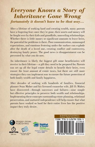 The Greatest Gift is the ultimate guide to successful estate planning-without the drama!For anyone who has worked their entire life to amass wealth, one of their biggest fears is that their kids will fight over their assets after they have passed. In The Greatest Gift, the authors lay out a plan to keep this from happening by providing families with the tools they need for the successful transfer of wealth, allowing heirs to carry on their family's legacy.Based upon Sean Maher’s extensive experience as a financial planner and interviews with families who navigated a peaceful inheritance, this helpful resource identifies 9 Principles for Successful Wealth Transfer. It reinforces those principles with stories of inheritances gone right and those gone wrong, incorporating insights and tools from coauthor Jill D. Maher’s field of work—psychology.Implementing the nine principles allows future generations to build upon their family’s rich and lasting legacy rather than fight over assets and money—no matter the amount. As such, The Greatest Gift is for anyone who values preserving relational wealth as much as they value building financial wealth.A useful guide for parents, grandparents, aunts, uncles, or anyone who envisions their heirs thriving and living in harmony after they’re gone, it’s also for people who wish to be a catalyst for proactive conversations with their siblings, cousins, or anyone else who might share in an inheritance.The Greatest Gift offers tools that are easy to implement to ensure families do not end up being the subject of a Dateline episode of an inheritance gone terribly wrong.