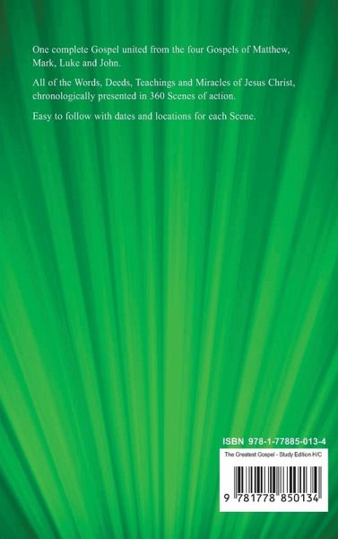 One Complete Gospel United From Four! Study Edition Hard Cover - 246 pages The Greatest Gospel is a single, complete, unified Word-for-Word account of all that Jesus Christ said and did, as recorded within the four New Testament Gospels of Matthew, Mark, Luke and John. All sayings and events are presented in chronological order. What makes this Gospel "The Greatest"?the entire Gospel Story told in 360 Chronological Scenes of Action Dates and Locations provided for each Scene more than 21% shorter to read (compared to reading the four Gospels) 350+ References to the Old Testament Scriptures, historical places and people Nine Chapter Maps of Israel and of Jerusalem (that show where Jesus travelled) Fifteen pages of Notes detailing the Features of this book Seven Articles about why The Greatest Gospel was created The Four Gospel Comparison Chart highlighting the differences between the four accounts The Gospel Verse Cross-Reference Appendix (shows where every Gospel verse is located) With the overlap and duplication between the parallel sections of the four Gospels texts unified, The Greatest Gospel is more than 21% shorter to read, compared to reading the four individual Gospel accounts back-to-back. Other Editions: * Study Edition - Paperback * The Red Letter Gospel - with all of the Words of Jesus Christ in red