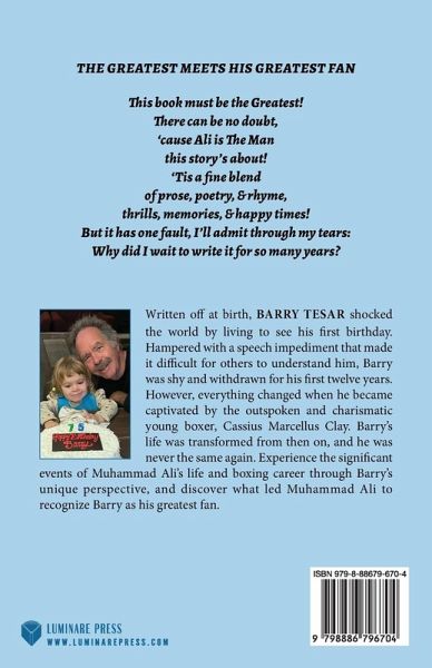 The Greatest Meets His Greatest Fan This book must be the Greatest! There can be no doubt, 'cause Ali is The Man this story's about! 'Tis a fine blend of prose, poetry, & rhyme, thrills, memories, & happy times! But it has one fault, I'll admit through my tears: Why did I wait to write it for so many years? ¿¿¿¿¿¿Author's Opening Remarks I am known among my friends as someone who loves to tell stories. The one about the time I met Muhammad Ali is the one I love telling the most. I have told it to friends, co-workers, random people in the grocery line, and, to be honest, total strangers on the street. Now, if you are interested, I would like to tell my story to you. When I met Muhammad Ali in December of 1976, he was enjoying life at the zenith of his glory. This was his Golden Era. He was the undisputed heavyweight champion of the world, universally recognized as the most famous man on the planet, and everyone from homeless people on the street to world leaders, celebrities, and kings wanted to meet him. It's a standard caution that meeting one's childhood hero can be disillusioning. Thankfully, that wasn't the case for me. Muhammad Ali was as friendly and kind as I could have ever imagined. Even after all these years, reliving the random chain of unlikely events that brought Ali and me together still fills me with joy and wonder. It so easily could have not happened- but it did! And I will be forever grateful. Here is my story. I hope you enjoy it.