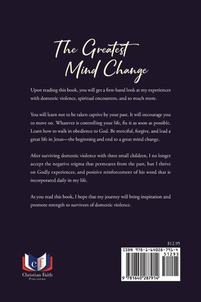 Upon reading this book, you will get a first-hand look at my experiences with domestic violence, spiritual encounters, and so much more. You will learn not to be taken captive by your past. It will encourage you to move on. Whatever is controlling your life, fix it as soon as possible. Learn how to walk in obedience to God. Be merciful, forgive, and lead a great life in Jesusthe beginning and end to a great mind change. After surviving domestic violence with three small children, I no longer accept the negative stigma that permeates from the past, but I thrive on Godly experiences, and positive reinforcement of his word that is incorporated daily in my life. As you read this book, I hope that my journey will bring inspiration and promote strength to survivors of domestic violence.