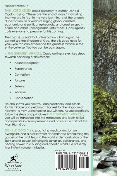The Lord God spoke expressly to author Donald Ogolo, saying, "These are the end of days," indicating that we are in fact in the very last minute of the church dispensation. In a world of raging global disasters, economic and political upheavals, and great surges in crime and other unimaginable sinful vices, God urgently calls everyone to prepare for His coming. The Lord Jesus said that unless a man is born again, he cannot see the kingdom of God. There is good news for you-you too can experience the greatest miracle in the entire universe. You too can be born again. In The Greatest Miracle, Ogolo outlines seven key steps towards partaking of this miracle: ¿ Acknowledgment ¿ Repentance ¿ Confession ¿ Forsake ¿ Believe ¿ Receive ¿ Consecration He also shows you how you can practically lead others to this miracle and yield much harvest for the kingdom of heaven-a very useful tool for soul winners. As you practically follow the steps and principles in The Greatest Miracle, you will be translated into the miraculous and learn to live and operate in divine presence and power as a child of the Most High God.
