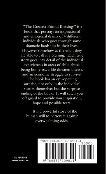 The true stories portrays an inspirational and emotional drama of 4 different individuals who goes through some dramatic hardships in their lives in areas of child abuse, a life threatening disease, being homeless and an economy struggle to survive. Not only are the ending of each story are heart touching and inspirational but somehow are able to call their hardships a blessing. In addition be prepared to be caught off guard of the surprise ending of the book as well. It is a powerful book of the human will to persevere against overwhelming odds. May the Greatest PAINFUL Blessing be a handbook to adults, teens and children experiencing hardship. May it give a sense of hope and understand that in areas of abuse, neglect, homelessness, sickness and economical struggles there is a blessing in disguise. Portion of your purchase will be donated to help the homeless, neglect and abused children.
