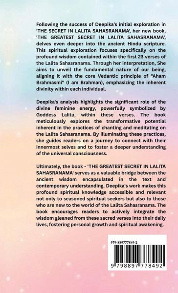 The success of Deepika's debut book, 'THE SECRET IN LALITA SAHASRANAMA' fueled her desire to explore more of the profound wisdom contained within the Lalita Sahasranama. THE GREATEST SECRET IN LALITA SAHASRANAMA by Deepika is a spiritual exploration of the ancient Hindu text, Lalita Sahasranama. This book delves into the profound wisdom contained within the first 23 verses of this sacred text, revealing the true nature of our being and aligning with the Vedantic principle of "Aham Brahmasmi" (I am Brahman). Her interpretation of the text emphasizes the divine feminine energy, symbolized by Goddess Lalita. She explores the transformative power of Lalita Sahasranama chanting and meditation, guiding readers to connect with their inner selves and the universal consciousness. The book offers a deep dive into the spiritual significance of the text, encouraging readers to apply its wisdom in their daily lives. It provides a bridge between ancient wisdom and contemporary understanding, making it accessible to both spiritual seekers and newcomers to the world of Lalita Sahasranama.