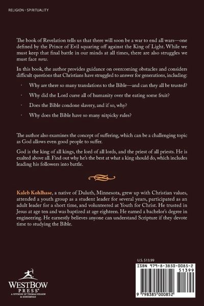 The book of Revelation tells us that there will soon be a war to end all wars-one defined by the Prince of Evil squaring off against the King of Light. While we must keep that final battle in our minds at all times, there are also struggles we must face now. In this book, the author provides guidance on overcoming obstacles and considers difficult questions that Christians have struggled to answer for generations, including: ¿Why are there so many translations to the Bible-and can they all be trusted? ¿Why did the Lord curse all of humanity over the eating of some fruit? ¿Does the Bible condone slavery, and if so, why? ¿Why does the Bible have so many nitpicky rules? The author also examines the concept of suffering, which can be a challenging topic as God allows even good people to suffer. God is the king of all kings, the lord of all lords, and the priest of all priests. He is exalted above all. Find out why he's the best at what a king should do, which includes leading his followers into battle.