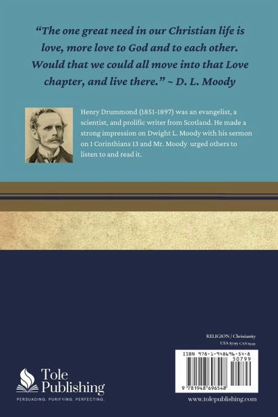 Do you want to be a guiding light and source of encouragement in your family, church, and community? If so, then you must know what true love is. In this classic devotional by Henry Drummond, he explains what he calls The Spectrum of Love, found in 1 Corinthians 13. He analyzes each word that Paul uses to define love and applies it to daily life. Not only that, but he also explains why love is the "greatest" of the triad Paul mentions, i.e., faith, hope, and love (1 Corinthians 13:13). This book is a delightful description of love that will help every Christian understand how they can grow in it and have better relationships because of a stronger love for others. What else does this book offer?It teaches how time and will-power will not change us, but Christ can. You will discover the only one thing that is greater than happiness in this world. Mr. Drummond explains what Paul means by "childish things" in verse eleven. He also writes about how David Livingstone, a missionary to Africa, influenced them without speaking their native language. Also, you will find out what is the great secret of personal influence. If you have a desire to grow in your love for others, then Mr. Drummond's book is a must for you because he eloquently expounds upon 1 Corinthians 13, carefully explains the true meaning of love, and thoughtfully applies it to daily life. Learn to love like Christ, starting today!