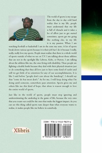 The world of sports is my escape from the day to day cold hard reality that is my life, people must understand that my life is full of obstacle and it takes a lot of effort just to get started sometimes, sports get me going like nothing else, in my life it is my passion. When I am watching football or basketball I am in the zone my zone. A lot of sports break down various sports because it is their job but I do it because I really, really, really love my sports. People must realize that there is a whole world of sports outside of what we see on T.V. I am talking about those athletes that are not in the spotlight like Lebron, Kobe, or Peyton. I am talking about the athletes like me, the ones living with disability. These people are fighting a double battle because they deal with their physical situation just to do something that they all love just to have some kind of outlet and still we get little of no attention for any of our accomplishments. It is like I said before "people don't care about the handicap", I should say that "some do but most don't." As for me, I will keep doing what I'm doing until someone, somewhere pays attention. Sports gives me and others like me this kind of hope, that alone is reason enough to love the entire world of sports. Just like in the world of sports, people must stop ignoring and underestimating the underdog in the game of life, because the very ones that you count out could be the ones that make the biggest impact. As you can see this thing called sports runs deeper than what everyone wants to realize, it makes people like me believe in somebody.