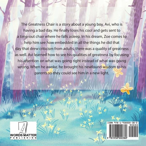 The Greatness Chair is a story about a young boy, Avi, who is having a bad day. He finally loses his cool and gets sent to a time out chair where he falls asleep. In his dream, Zoe comes to help him see how embedded in all the things he did that day that drew criticism from adults, there was quality of greatness as well. Avi learned how to see his qualities of greatness by focusing his attention on what was going right instead of what was going wrong. When he awoke, he brought his newfound wisdom to his parents so they could see him in a new light.