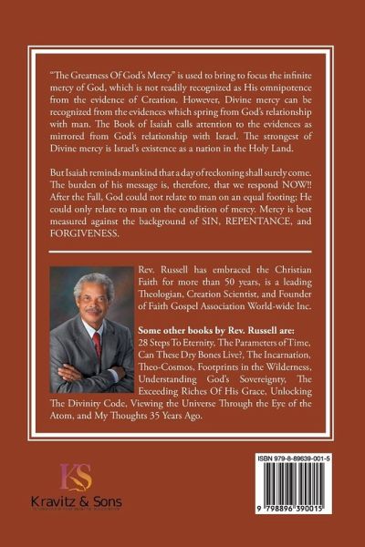 "The Greatness Of God's Mercy" is used to bring to focus the infinite mercy of God, which is not readily recognized as His omnipotence from the evidence of Creation. However, Divine mercy can be recognized from the evidences which spring from God's relationship with man. The Book of Isaiah calls attention to the evidences as mirrored from God's relationship with Israel. The strongest of Divine mercy is Israel's existence as a nation in the Holy Land. But Isaiah reminds mankind that a day of reckoning shall surely come. The burden of his message is, therefore, that we respond NOW!! After the Fall, God could not relate to man on an equal footing; He could only relate to man on the condition of mercy. Mercy is best measured against the background of SIN, REPENTANCE, and FORGIVENESS. Some of the other books written by Rev. Russell are 28 Steps To Eternity, The Parameters Of Time, Can These Dry Bones Live?, The Exceeding Riches Of His Grace, Footprints In The Wilderness, Unlocking The Divinity Code, Theo-Cosmos, Viewing The Atom Through The Eye Of The Atom.