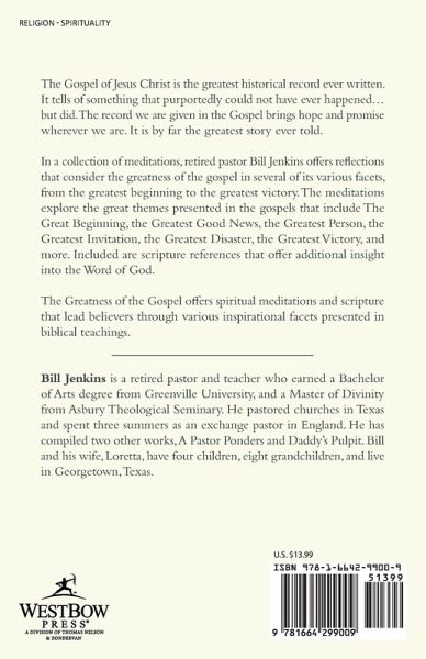 The Gospel of Jesus Christ is the greatest historical record ever written. It tells of something that purportedly could not have ever happened...but did. The record we are given in the Gospel brings hope and promise wherever we are. It is by far the greatest story ever told. In a collection of meditations, retired pastor Bill Jenkins offers reflections that consider the greatness of the gospel in several of its various facets, from the greatest beginning to the greatest victory. The meditations explore the great themes presented in the gospels that include The Great Beginning, the Greatest Good News, the Greatest Person, the Greatest Invitation, the Greatest Disaster, the Greatest Victory, and more. Included are scripture references that offer additional insight into the Word of God. The Greatness of the Gospel offers spiritual meditations and scripture that lead believers through various inspirational facets presented in biblical teachings.