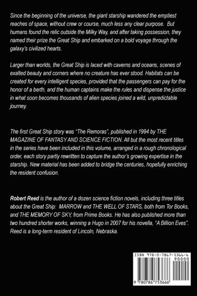 Since the beginning of the universe, the giant starship wandered the emptiest reaches of space, without crew or course, much less any clear purpose. But humans found the relic outside the Milky Way, and after taking possession, they named their prize the Great Ship and embarked on a bold voyage through the galaxy’s civilized hearts. Larger than worlds, the Great Ship is laced with caverns and oceans, scenes of exalted beauty and corners where no creature has ever stood. Habitats can be created for every intelligent species, provided that the passengers can pay for the honor of a berth, and the human captains make the rules and dispense the justice in what soon becomes thousands of alien species joined a wild, unpredictable journey. The first Great Ship story was “The Remoras”, published in 1994 by THE MAGAZINE OF FANTASY AND SCIENCE FICTION. All but the most recent titles in the series have been included in this volume, arranged in a rough chronological order, each story partly rewritten to capture the author’s growing expertise in the starship. New material has been added to bridge the centuries, hopefully enriching the resident confusion. Robert Reed is the author of a dozen science fiction novels, including two titles about the Great Ship: MARROW and THE WELL OF STARS, both from Tor Books. He has also published more than two hundred shorter works, winning a Hugo in 2007 for his novella, “A Billion Eves”. Reed is a long-term resident of Lincoln, Nebraska.