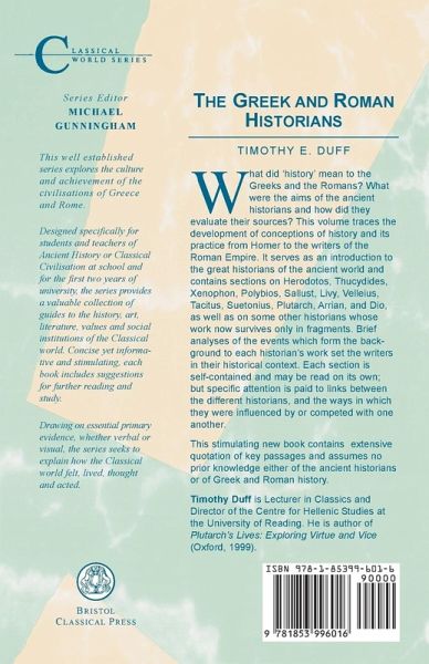 What did 'history' mean to the Greeks and the Romans? This volume traces the development of conceptions of history and its practice from Homer to the writers of the Roman Empire. It serves as an introduction to the great historians of the ancient world and contains sections on Herodotus, Thucydides, Xenophon, Polybius, Livy, Tacitus, Suetonius and others. Each section is designed to be self-contained and may be read on its own; but links between the different historians, the ways in which they competed with and were influenced by one another, are constantly brought out. The main ancient historians are household names but Duff stresses not only the ways in which they seem familiar but also those in which they are alien to today's readers; for the ancient historian was always concerned with improving the reader as much as informing him. As well as the most familiar names, Duff also includes in his account others whose work survives only in fragments, especially Greeks of the fourth century BC and the Hellenistic era, whose entire works were known to their Roman successors.