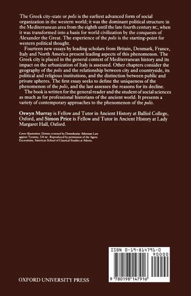 These fourteen critical essays examine the autonomous Greek polis from its origins in the "Dark Age" until the point at which it was transformed into a basis for world civilization by the conquests of Alexander the Great and the subsequent expansion of polis institutions. Contributors such as B. D'Agostino, N. Purcell, O. Rackham, A. Snodgrass, L. Nixon, S. Price, M. Jameson, P. Schmitt-Pantel, M.H. Hansen, O. Murray, and W.G. Runciman, among others, discuss a wide range of topics, including the relationship between landscape and city, the relationship between public and private spheres, the phenomenon of the polis, the urbanization of the Italian peninsula, and the eventual decline of the polis.