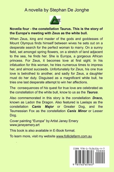 Novella four - the constellation Taurus and the story of the Jupiter's moon Europa and her meeting with the white bull.When Zeus, king and master of the gods and goddesses of Mount Olympus finds himself between wives he sets out on a desperate search for the perfect woman to marry. On a sunny field, set among spring flowers, on a stretch of land adjacent to the sea, he finds her. She is Europa, a gorgeous African princess. For Zeus, it becomes love at first sight. In his infatuation for this woman, he tries numerous times to impress her, and almost succeeds. Sadly, for Zeus, his one true love is betrothed to another, and sadly for Zeus, a daughter must do her duty. Disguised as a magnificent white bull, he tries one last desperate attempt to have her. The consequences of his quest for true love are celebrated as the constellation of the white bull, know to us as the Taurus.Also commemorated in this story is the constellation Draco, known as Ladon the Dragon. Also featured is Laelaps as the constellation Canis Major or Greater Dog, and the Teumessian Fox as the constellation Canis Minor or Lesser Dog.