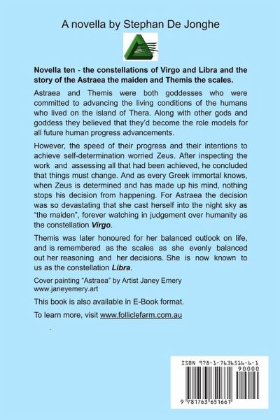 Novella ten - the constellations of Virgo & Libra and the story of the Astraea the maiden, and Themis the scales.Astraea and Themis were both goddesses who were committed to advancing the living conditions of the humans who lived on the island of Thera. Along with other gods and goddess they believed that they'd become the role models for all future human progress advancements.Astraea strongly believed in justice and sort punishment for those that transgressed against the common good. Her belief was that punishment was a deterrent and that the formal process of trial and conviction for those…mehr