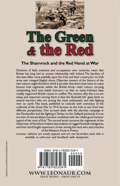 The Shamrock and the Red Hand at War Divisions of faith, invasions and occupations over centuries, mean that Britain has long had an uneasy relationship with Ireland. The burdens of this have fallen most painfully upon the Irish and their country, for no Irish army ever ravaged English shires. Objective viewers of the history of the two nations might therefore think it peculiar that there have been so many famous Irish regiments within the British Army-with colours carrying outstanding, hard won, battle honours-or that so many Irishmen have readily supported British causes in conflict. The reasons why this is so are many, and important among them is that the 'Emerald Isle' gives birth to natural warriors who are among the most enthusiastic and able fighting men on earth. This book, published to coincide with centenary of the outbreak of the Great War in 1914, focuses on the Irish at war from two different perspectives. One account deals with the abortive campaign in the Dardanelles and the fighting in Turkey on the Gallipoli peninsula. It is an account of extraordinary heroism combined with the ribald good humour typical of the 'sons of Erin.' The second book concerns the regiments of the Ulstermen of Northern Ireland, descendents of rugged Scottish immigrants, and their hard fought experience of war among the mud, wire and trenches of the Western Front in France. Leonaur editions are newly typeset and are not facsimiles; each title is available in softcover and hardback with dustjacket.