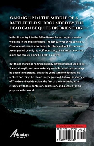 Waking up in the middle of a battlefield surrounded by the dead can be quite disorienting. In this first entry int the Fallen Heroes Reborn series, a soldier wakes up in the midst of chaos. The last survivor of his battalion, Chronol must escape now enemy territory and look for survivors. Accompanied by only his wolfhound pup, he ventures across the plains and forests, doing his best to survive. But things change as he finds his body different than it used to be. Speed, strength, and an unnatural glow in his eyes mark a change he doesn't understand. But as the years turn into decades, he realizes on thing: he can no longer grow old. Follow the journey of The Green-Eyed Guardian, the first of the immortals, as he struggles with loss, confusion, depression, and the search for his purpose in this world. Waking up in the middle of a battlefield surrounded by the dead can be quite disorienting. In this first entry int the Fallen Heroes Reborn series, a soldier wakes up in the midst of chaos. The last survivor of his battalion, Chronol must escape now enemy territory and look for survivors. Accompanied by only his wolfhound pup, he ventures across the plains and forests, doing his best to survive. But things change as he finds his body different than it used to be. Speed, strength, and an unnatural glow in his eyes mark a change he doesn't understand. But as the years turn into decades, he realizes on thing: he can no longer grow old. Follow the journey of The Green-Eyed Guardian, the first of the immortals, as he struggles with loss, confusion, depression, and the search for his purpose in this world.