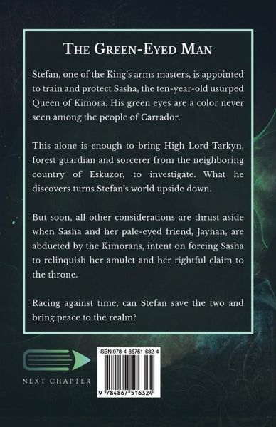 Stefan, one of the King's arms masters, is appointed to train and protect Sasha, the ten-year-old usurped Queen of Kimora. His green eyes are a color never seen among the people of Carrador. This alone is enough to bring High Lord Tarkyn, forest guardian and sorcerer from the neighboring country of Eskuzor, to investigate. What he discovers turns Stefan's world upside down. But soon, all other considerations are thrust aside when Sasha and her pale-eyed friend, Jayhan, are abducted by the Kimorans, intent on forcing Sasha to relinquish her amulet and her rightful claim to the throne. Racing against time, can Stefan save the two and bring peace to the realm?