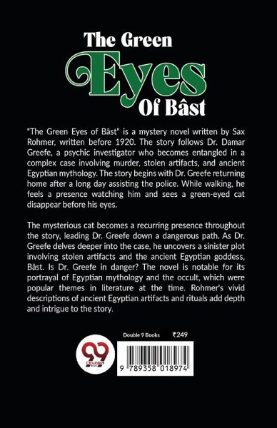 "The Green Eyes of Bâst" is a mystery novel written by Sax Rohmer, written before 1920. The story follows Dr. Damar Greefe, a psychic investigator who becomes entangled in a complex case involving murder, stolen artifacts, and ancient Egyptian mythology. The story begins with Dr. Greefe returning home after a long day assisting the police. While walking, he feels a presence watching him and sees a green-eyed cat disappear before his eyes. The mysterious cat becomes a recurring presence throughout the story, leading Dr. Greefe down a dangerous path. As Dr. Greefe delves deeper into the case, he uncovers a sinister plot involving stolen artifacts and the ancient Egyptian goddess, Bâst. Is Dr. Greefe in danger? The novel is notable for its portrayal of Egyptian mythology and the occult, which were popular themes in literature at the time. Rohmer's vivid descriptions of ancient Egyptian artifacts and rituals add depth and intrigue to the story.