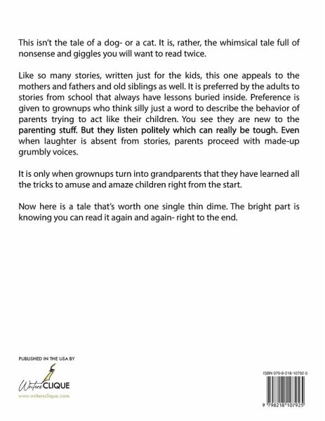 This isn't the tale of a dog- or a cat. It is, instead, the whimsical tale full of nonsense and giggles you will want to read twice. Like so many stories written just for the kids, this one also appeals to the mothers, fathers, and older siblings. It is preferred by adults to stories from school that always have lessons buried inside. Preference is given to grownups who think silly is just a word to describe the behavior of parents trying to act like their children. You see, they are new to the parenting stuff. But they listen politely, which can really be tough. Even when laughter is absent from stories, parents proceed with made-up grumbly voices. It is only when grownups turn into grandparents that they learn all the tricks to amuse and amaze children right from the start. Now here is a tale that's worth one single thin dime. The bright part is knowing you can read it again and again- right to the end.