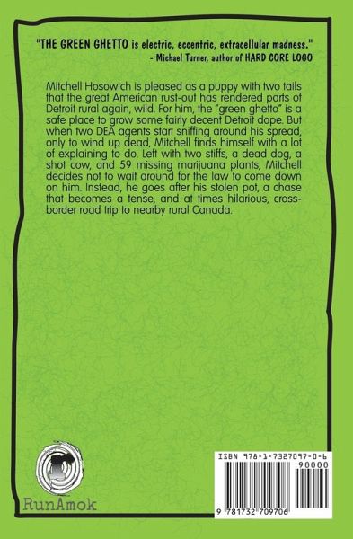 Mitchell Hosowich is pleased as a puppy with two tails that the great American rust-out has rendered parts of Detroit rural again, wild. For him, the "Green Ghetto," as the bureaucrats have come to call it, is a safe place to grow some fairly decent Detroit dope. But when two DEA agents start sniffing around his spread, only to wind up dead, Mitchell finds himself with a lot of explaining to do. Left with two stiffs, a dead dog, a shot cow, and fifty-nine missing marijuana plants, Mitchell decides not to wait around for the law to come down on him. Instead, he goes after his stolen pot, a chase that becomes a tense, and at times hilarious, cross-border road trip to nearby rural Canada. Set in a hyper post-9/11 culture, The Green Ghetto explores the universal theme of being compromised. But mostly, it is the story of how America got here from there in the war on drugs, terror, and words.