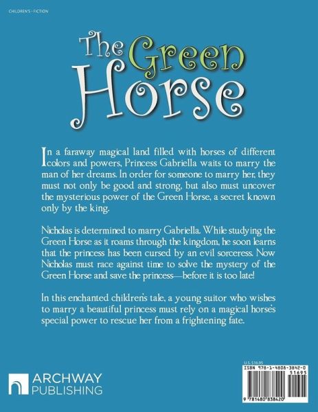 In a faraway magical land filled with horses of different colors and powers, Princess Gabriella waits to marry the man of her dreams. In order for someone to marry her, they must not only be good and strong, but also must uncover the mysterious power of the Green Horse, a secret known only by the king. Nicholas is determined to marry Gabriella. While studying the Green Horse as it roams through the kingdom, he soon learns that the princess has been cursed by an evil sorceress. Now Nicholas must race against time to solve the mystery of the Green Horse and save the princessbefore it is too late! In this enchanted childrens tale, a young suitor who wishes to marry a beautiful princess must rely on a magical horses special power to rescue her from a frightening fate.