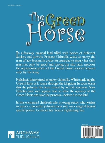 In a faraway magical land filled with horses of different colors and powers, Princess Gabriella waits to marry the man of her dreams. In order for someone to marry her, they must not only be good and strong, but also must uncover the mysterious power of the Green Horse, a secret known only by the king. Nicholas is determined to marry Gabriella. While studying the Green Horse as it roams through the kingdom, he soon learns that the princess has been cursed by an evil sorceress. Now Nicholas must race against time to solve the mystery of the Green Horse and save the princessbefore it is too late! In this enchanted childrens tale, a young suitor who wishes to marry a beautiful princess must rely on a magical horses special power to rescue her from a frightening fate.