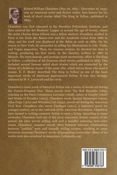 Another well written fantasy romantic relationship adventure thriller short story novel by Robert W. Chambers about life in New York City for young people. Their everyday lives and love. I would recommend this novel to readers of fantasy romance novels. (William) About the author: Robert William Chambers (May 26, 1865 - December 16, 1933) was an American artist and fiction writer, best known for his book of short stories titled The King in Yellow, published in 1895. Chambers was first educated at the Brooklyn Polytechnic Institute, and then entered the Art Students' League at around the age of twenty, where the artist Charles Dana Gibson was a fellow student. Chambers studied in Paris at the École des Beaux-Arts and the Académie Julian from 1886 to 1893, and his work was displayed at the Salon as early as 1889. On his return to New York, he succeeded in selling his illustrations to Life, Truth, and Vogue magazines. Then, for reasons unclear, he devoted his time to writing, producing his first novel, In the Quarter, written in 1887 in Munich. His most famous, and perhaps most meritorious, effort is The King in Yellow, a collection of Art Nouveau short stories published in 1895. This included several famous weird short stories which are connected by the theme of a fictitious drama of the same title, which drives those who read it insane. E. F. Bleiler described The King in Yellow as one of the most important works of American supernatural fiction. It was also strongly admired by H. P. Lovecraft and his circle. Chambers's main work of historical fiction was a series of novels set during the Franco-Prussian War. These novels were The Red Republic (1895, centring on the Paris Commune), Lorraine (1898), Ashes of Empire (1898) and Maids of Paradise (1903). Chambers wrote Special Messenger (1909), Ailsa Paige (1910) and Whistling Cat (1932), novels set during the American Civil War. Chambers also wrote Cardigan (1901), a historical novel for younger readers, set at the outbreak of the American Revolution. Chambers later turned to writing romantic fiction to earn a living. According to some estimates, Chambers had one of the most successful literary careers of his period, his later novels selling well and a handful achieving best-seller status. Chambers' romance novels often featured intimate relationships between "caddish" men and sexually willing women, resulting in some reviewers accusing Chambers' works of promoting immorality. Many of his works were also serialised in magazines. (wikipedia.org)