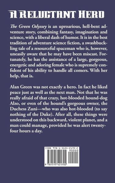 The Green Odyssey is an uproarious, hell-bent adventure story, combining fantasy, imagination and science, with a liberal dash of humor. It is in the best tradition of adventure science fiction, a swashbuckling tale of a resourceful spaceman who is, however, uneasily aware that he may have been miscast. Fortunately, he has the assistance of a large, gorgeous, energetic and adoring female who is supremely confident of his ability to handle all comers. With her help, that is.