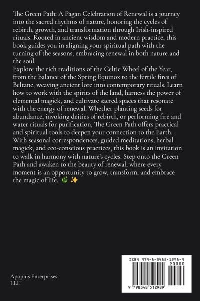 The Green Path: A Pagan Celebration of Renewal is a journey into the sacred rhythms of nature, honoring the cycles of rebirth, growth, and transformation through Irish-inspired rituals. Rooted in ancient wisdom and modern practice, this book guides you in aligning your spiritual path with the turning of the seasons, embracing renewal in both nature and the soul. Explore the rich traditions of the Celtic Wheel of the Year, from the balance of the Spring Equinox to the fertile fires of Beltane, weaving ancient lore into contemporary rituals. Learn how to work with the spirits of the land, harness the power of elemental magick, and cultivate sacred spaces that resonate with the energy of renewal. Whether planting seeds for abundance, invoking deities of rebirth, or performing fire and water rituals for purification, The Green Path offers practical and spiritual tools to deepen your connection to the Earth. With seasonal correspondences, guided meditations, herbal magick, and eco-conscious practices, this book is an invitation to walk in harmony with nature's cycles. Step onto the Green Path and awaken to the beauty of renewal, where every moment is an opportunity to grow, transform, and embrace the magic of life. ����✨